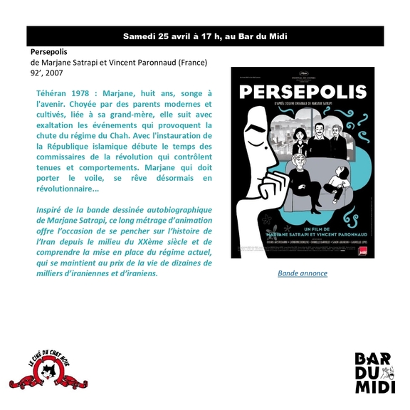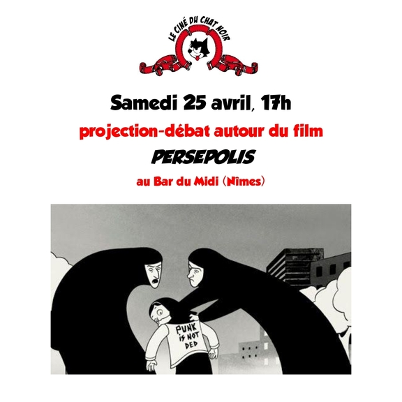 Le Ciné du Chat noir a le plaisir de vous inviter à une projection-débat autour du film 'Persepolis' de Marjane Satrapi et Vincent Paronnaud ce samedi 25 avril à 17 h au Bar du Midi à Nîmes (voir PJ).