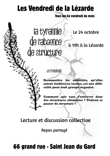 Petit rappel, le premier "vendredi de la Lézarde" c'est demain, avec une lecture collective autour de la brochure "La tyrannie de l'absence de structure" et un repas partagé, à 19 h au local de la Lézarde.