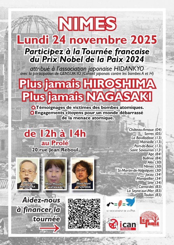 Le Mouvement de la Paix organise le lundi 24 novembre au Prolé de Nîmes, entre 12 heures et 14 heures, une rencontre avec la délégation de l'association Hidankyo, qui a reçu le Prix Nobel de la Paix en 2024 pour l'encourager dans son combat dédié à la mémoire des Hibakushas (victimes des bombes nucléaires d'Hiroshima et de Nagasaki) et réclamer un monde sans armes nucléaires.