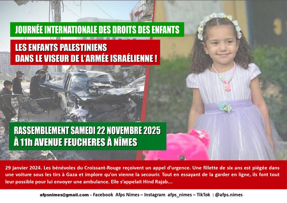 Un enfant palestinien massacré toutes les 45 mn ... Plus de 20 000 enfants tués depuis 2 ans de génocide ... enfants tués ou affamés, séparés de leur famille ou devenus orphelins ... enfants détenus dans les geôles israéliennes, maltraités, torturés ... privés d'école ...