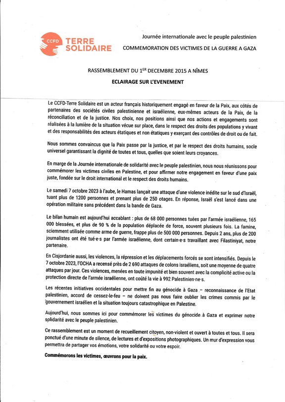CCFD Terre Solidaire - "Recueillement pour Gaza"